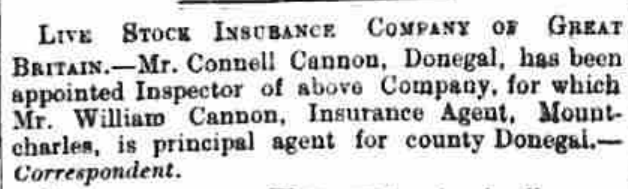 Connell Cannon, cattle dealer, Donegal Town, originally of Drimkeelan, is reported in the Londonderry Journal of 30 March, 1874, as having been appointed Inspector of the Live Stock Insurance Company of Great Britain. The principal agent for the company was William Cannon, insurance agent, Mountcharles – possibly a relation? This would have been one of Connell’s many side activities ancillary to his cattle dealing business.