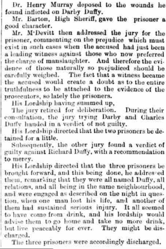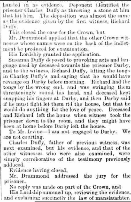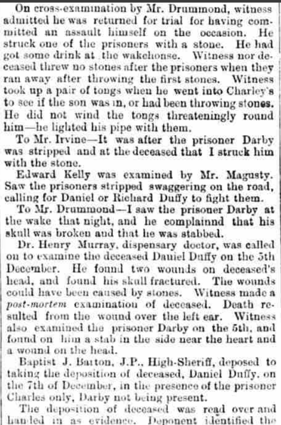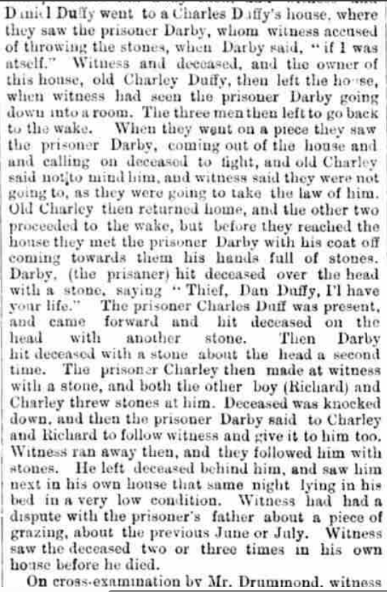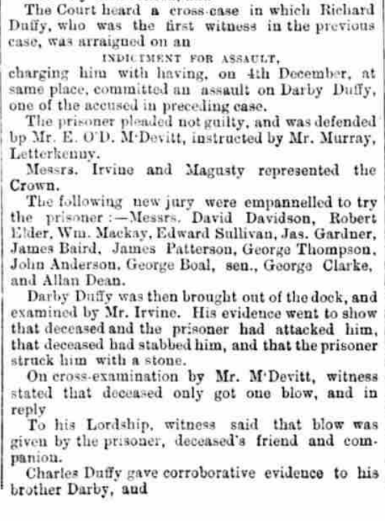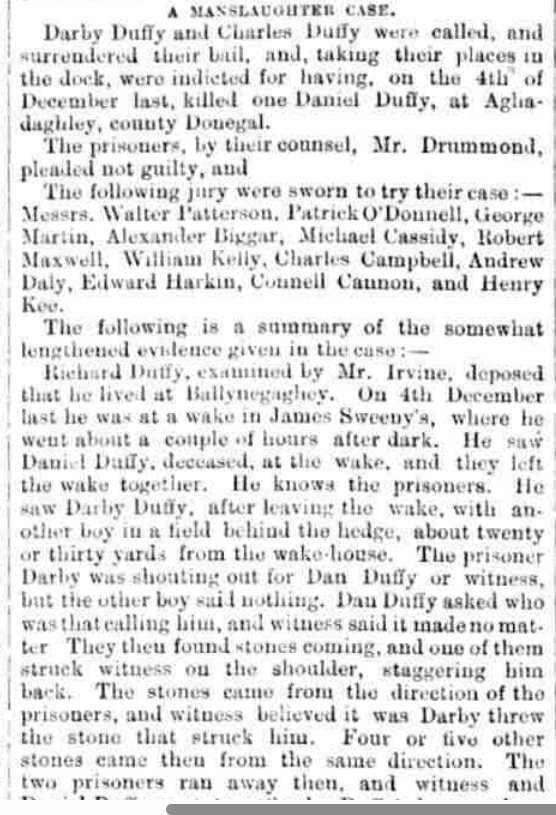 In 1874, Connell Cannon, originally of Drimkeelan, now a cattle dealer in Donegal Town, was back in court, this time sitting as juror on a manslaughter trial reported in the Derry Journal of 8th March 1877. See below for a full report of the trial.