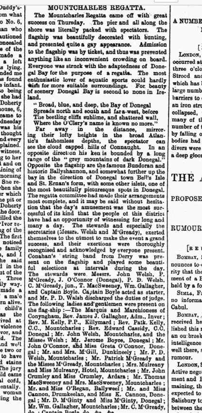 The same publication of Monday 27th July 1885 records Mr P. Cannon and Mrs Cannon of Drumkeelan as having attended Mountcharles Regatta the previous Thursday with Miss K Cannon, of Donegal – perhaps one of Connell’s daughters visiting! According to the Journal, the day’s amusement was the most successful that people of the neighbourhood had had the opportunity of witnessing for ‘long and many a day.’