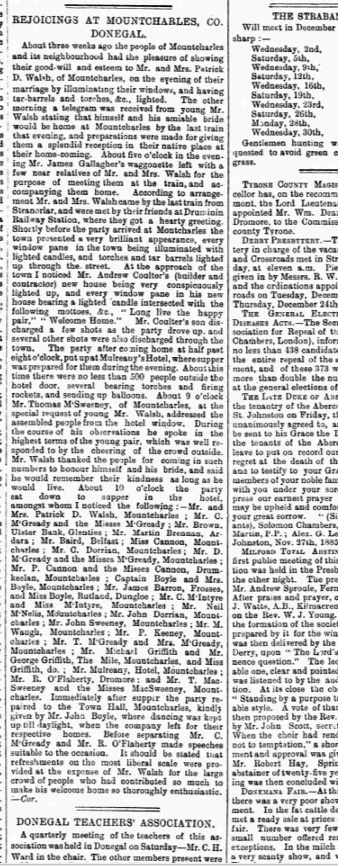On 2 December 1885, the Derry Journal records a reception held at Mountcharles, Donegal, to celebrate the return from their honeymoon of a young local couple, Mr and Mrs Patrick D Walsh. Every window pane in the town was illuminated with lighted candles, and torches and tar barrels lit along the street. Some of the candles were inscribed with the words ‘Long live the happy couple’ and ‘Welcome Home.’ A supper for the wedding party in Mulreany’s Hotel was attended by Mr P Cannon and the Misses Cannon, Drumkeelan, Mountcharles. Presumably the purpose of the Misses Cannon attending these events was that they too, would marry suitably!