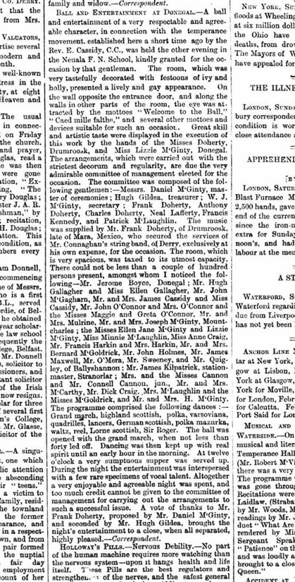 The Derry Journal of 11 February 1884 records a ball and entertainment ‘of a very respectable and agreeable character’ as having taken place in the Neuala National School, Donegal, festooned with holly and ivy for the occasion. A couple of hundred people attended; among those listed are Mrs and the Misses Cannon and Connell.