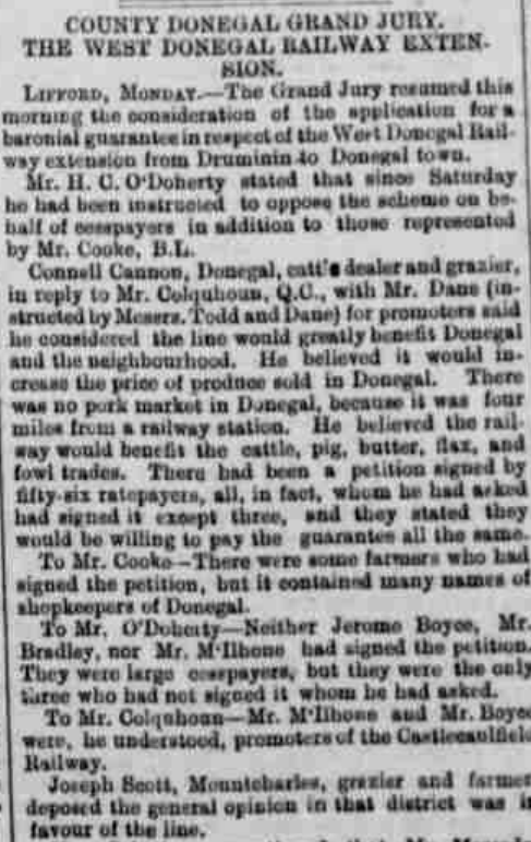 The Londonderry Standard, 22 July 1884, records evidence given by Connell Cannon, cattle-dealer and grazier in Donegal Town, originally of Drimkeelan, in support of an extension of the West Donegal Railway from Druminin to Donegal Town.